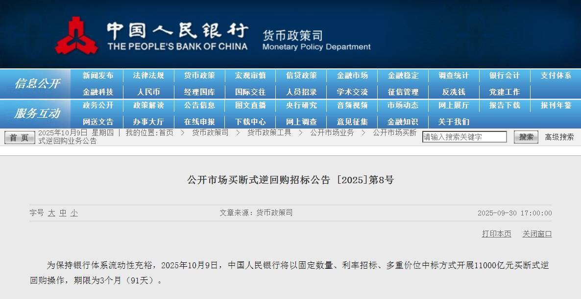 为保持银行体系流动性充裕,2025年10月9日,中国人民银行以固定数量、利率招标、多重价位中标方式开展11000亿元买断式逆回购操作,期限为3个月(91天)。数据显示,10月份将有8000亿元3个月期买断式逆回购到期。由此,中国人民银行今日开展11000亿元买断式逆回购操作,意味着10月份3个月期买断式逆回购加量续作3000亿元。